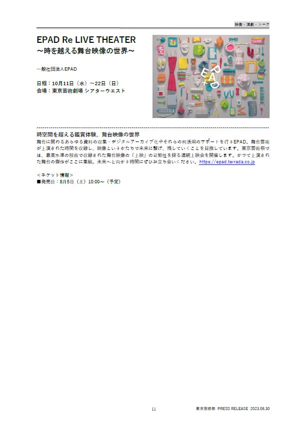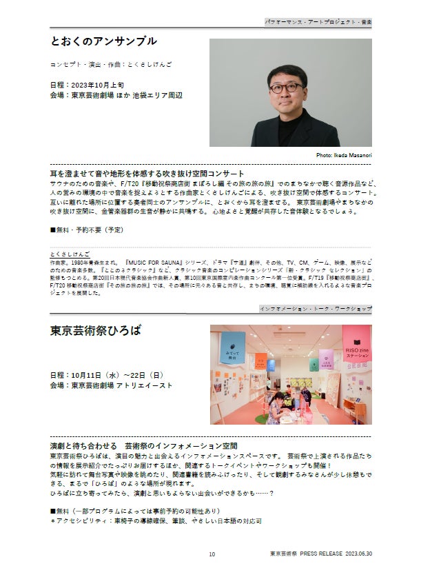 東京芸術祭実⾏委員会は、2023年9⽉1⽇(⾦)から10⽉29⽇(⽇)にかけて豊島区池袋エリアを中⼼に開催する「東京芸術祭 2023」の演⽬ラインアップを発表します。