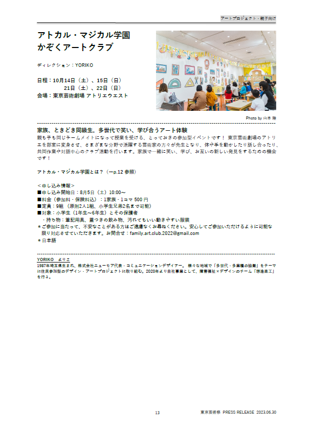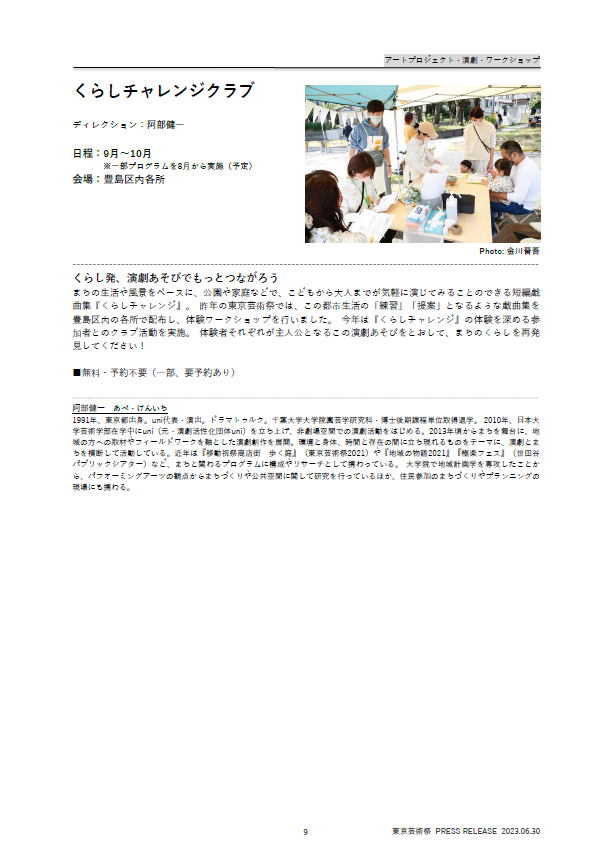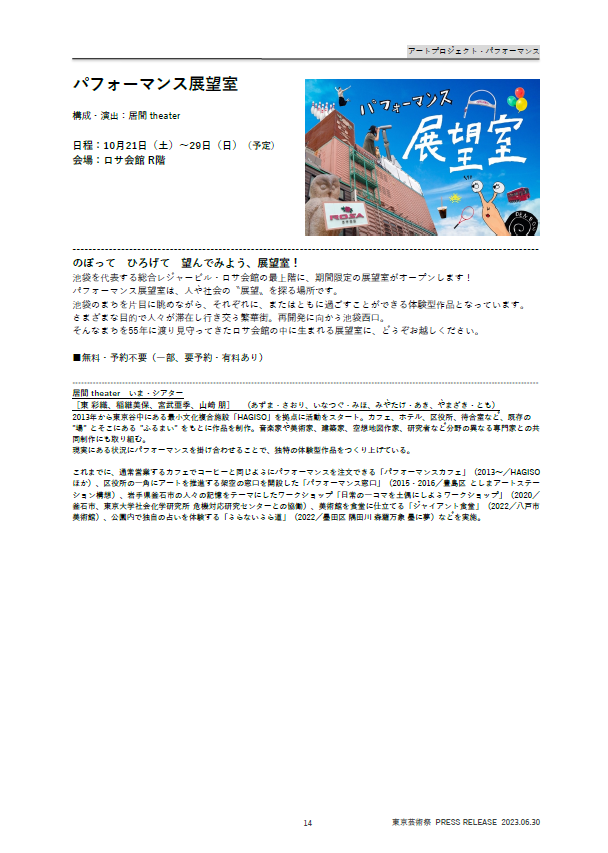 東京芸術祭実⾏委員会は、2023年9⽉1⽇(⾦)から10⽉29⽇(⽇)にかけて豊島区池袋エリアを中⼼に開催する「東京芸術祭 2023」の演⽬ラインアップを発表します。