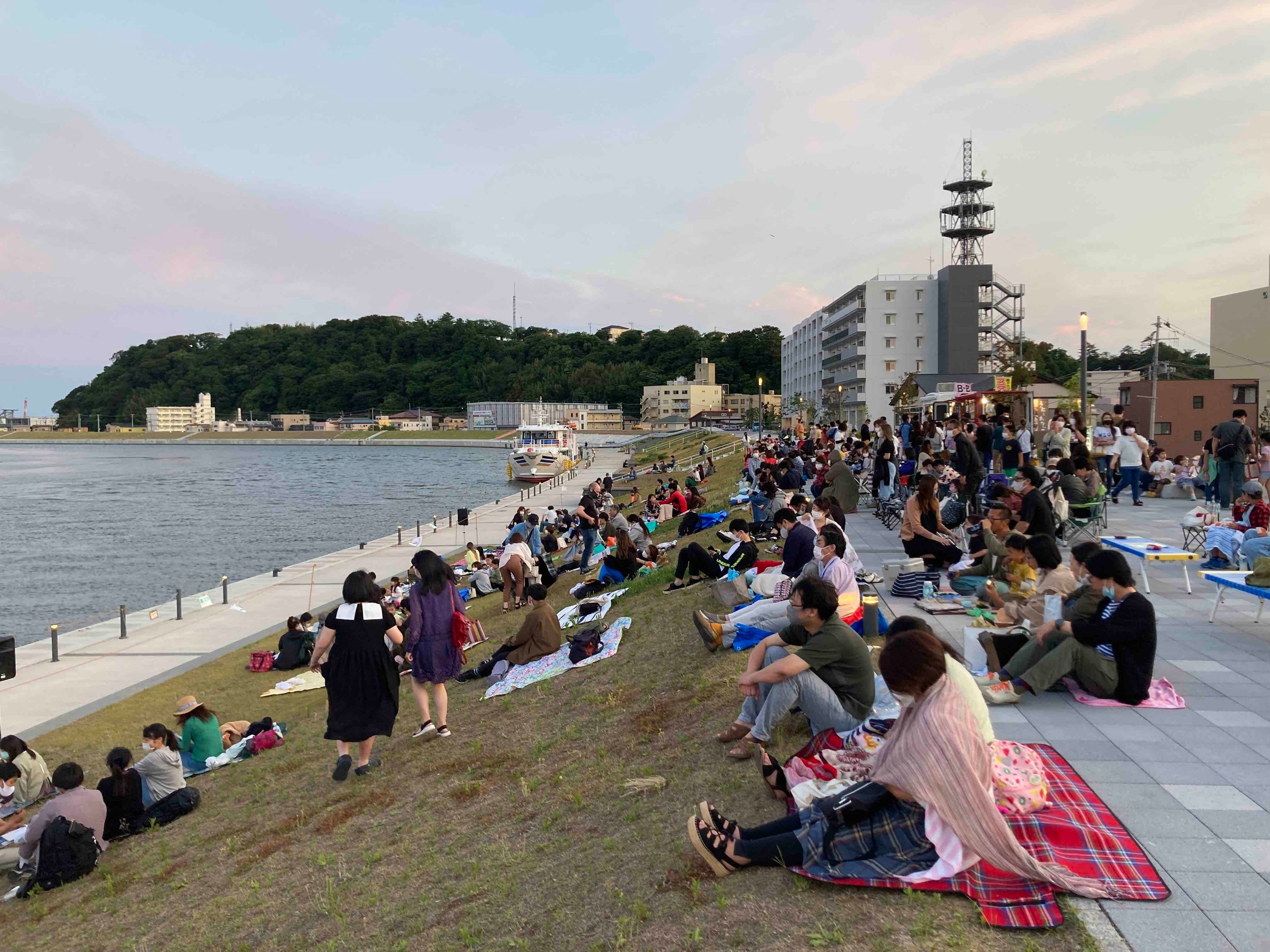 堤防の上で、みんなで一緒に映画を楽しむひとときは、この石巻の地域ならではな光景で、夏の風物詩の一つにもなっています。
