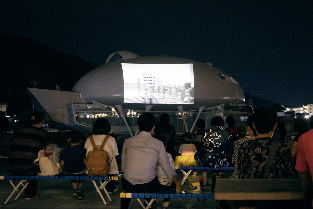 宮城県石巻市中瀬に立地する石ノ森萬画館をスクリーンに見立てた、野外上映会です。