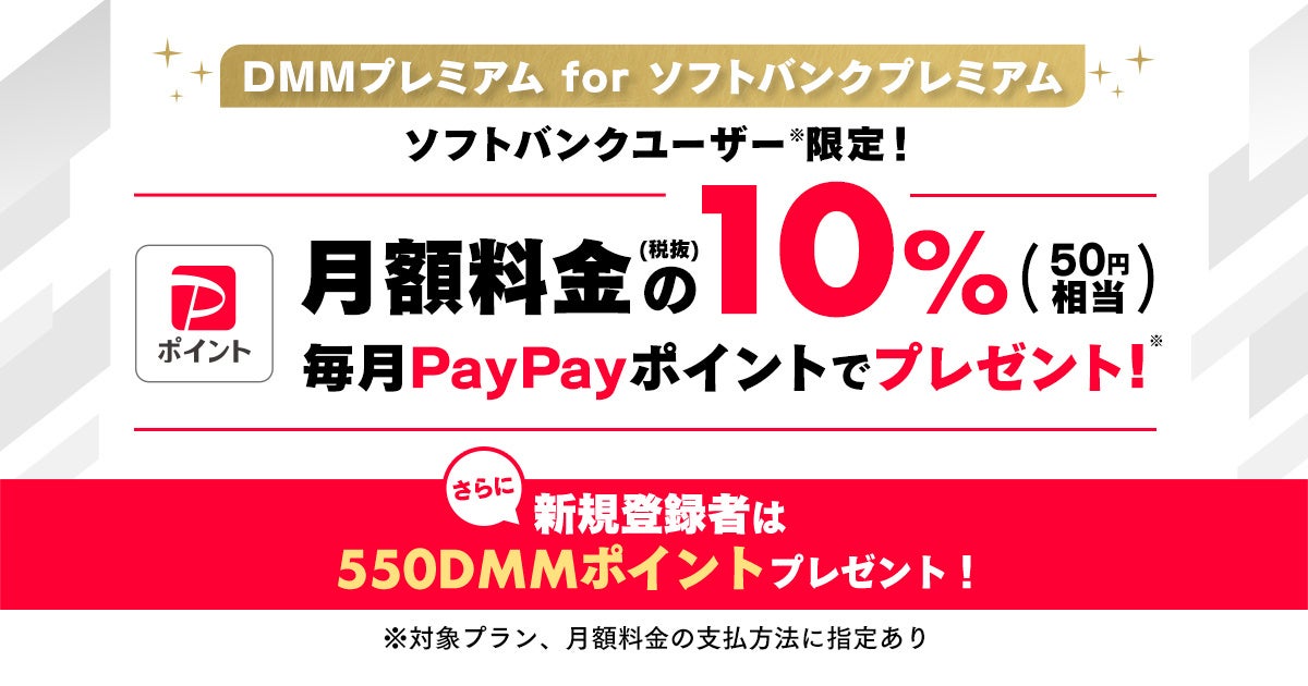 「DMMプレミアム」は、月額550円(税込)で総合動画配信サービス「DMM TV」を含むDMMの各種エンタメサービスを、横断的かつお得に楽しめるサブスク会員システムです。「DMMプレミアム for ソフトバンクプレミアム」に登録いただき、適用条件を満たした場合、月額料金(税抜)の10%相当(50円相当)がPayPayポイントで毎月もらえます。さらに、新規登録者には550円相当のDMMポイントもプレゼントいたします。