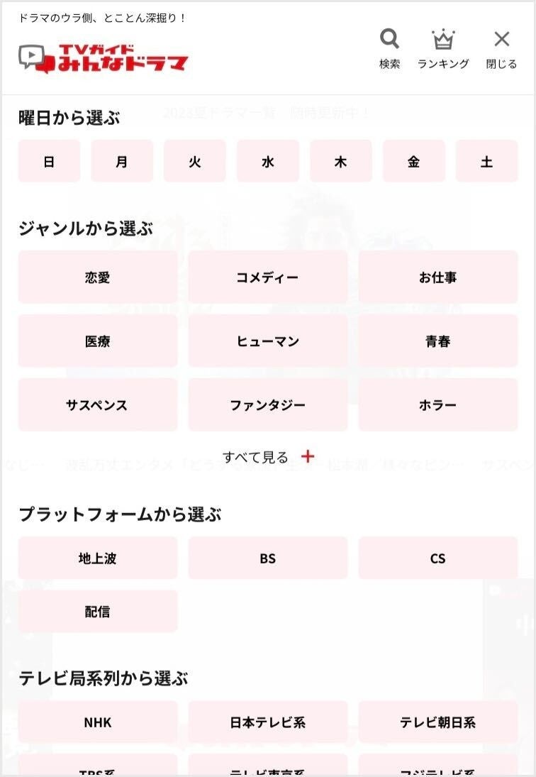 曜日、ジャンル、放送局、放送形態から、好みや、視聴環境などのライフスタイルに合ったドラマを素早く探すことができます。