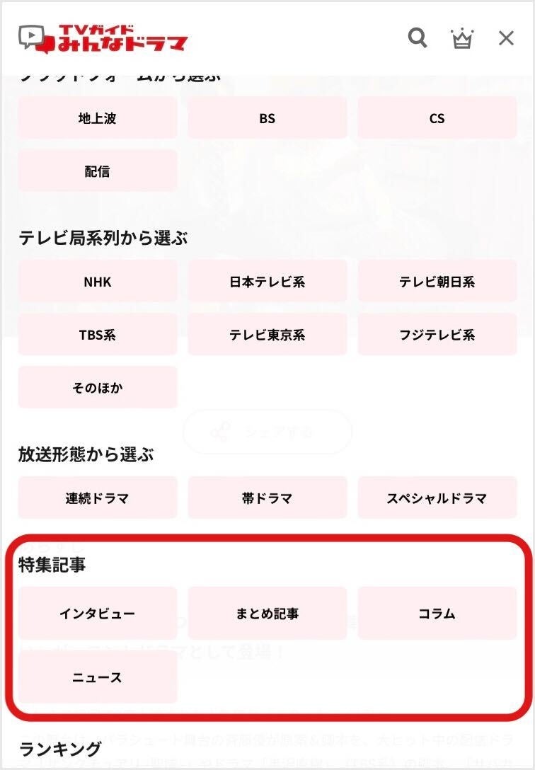 「恋愛ドラマ」「深夜ドラマ」「おすすめドラマ」など、ドラマ視聴者がよく検索するキーワードで、放送・配信中のドラマをカテゴライズ。これにより、興味のあるドラマを簡単に探せるほか、気になるドラマを新たに発見することができます。