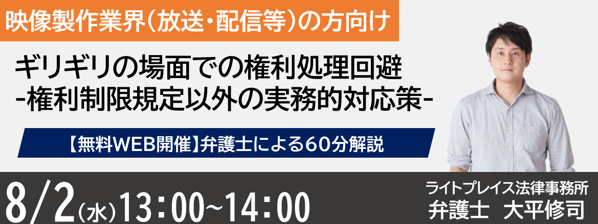 タイトル:『【映像製作業界(放送・配信等)の方向け】弁護士が教える「ギリギリの場面での権利処理回避-権利制限規定以外の実務的対応策-」』