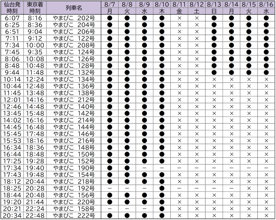 ※上段が下り(東京発仙台行き)、下段が上り(仙台発東京行き)です。