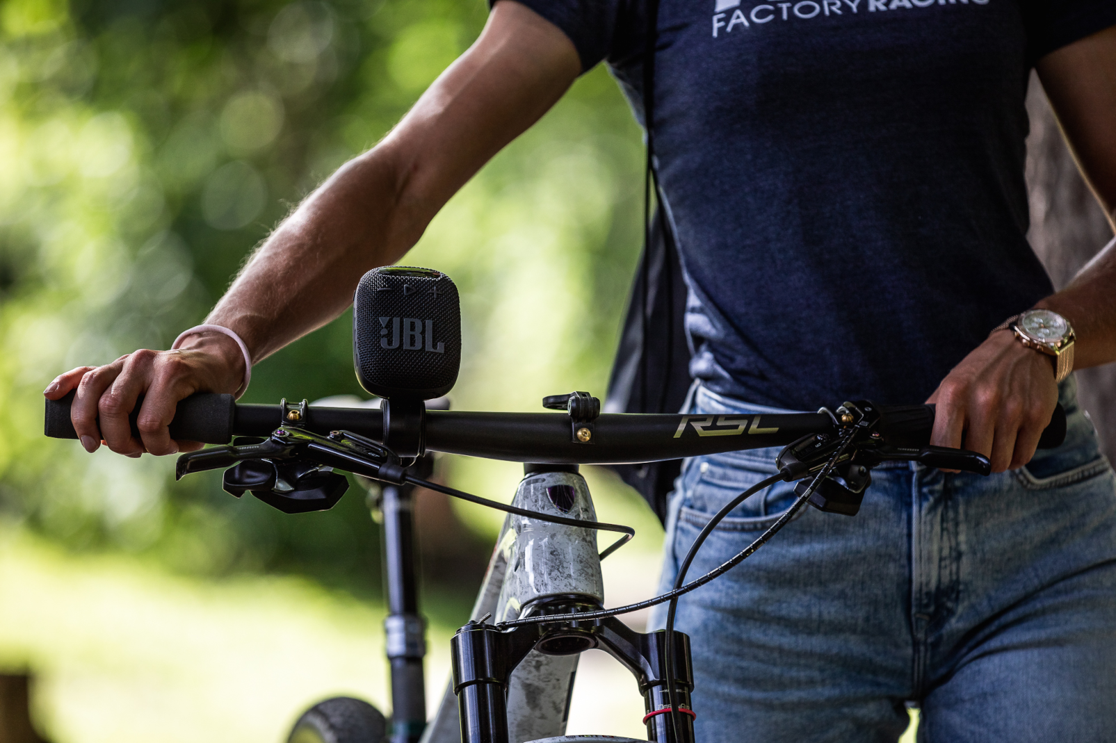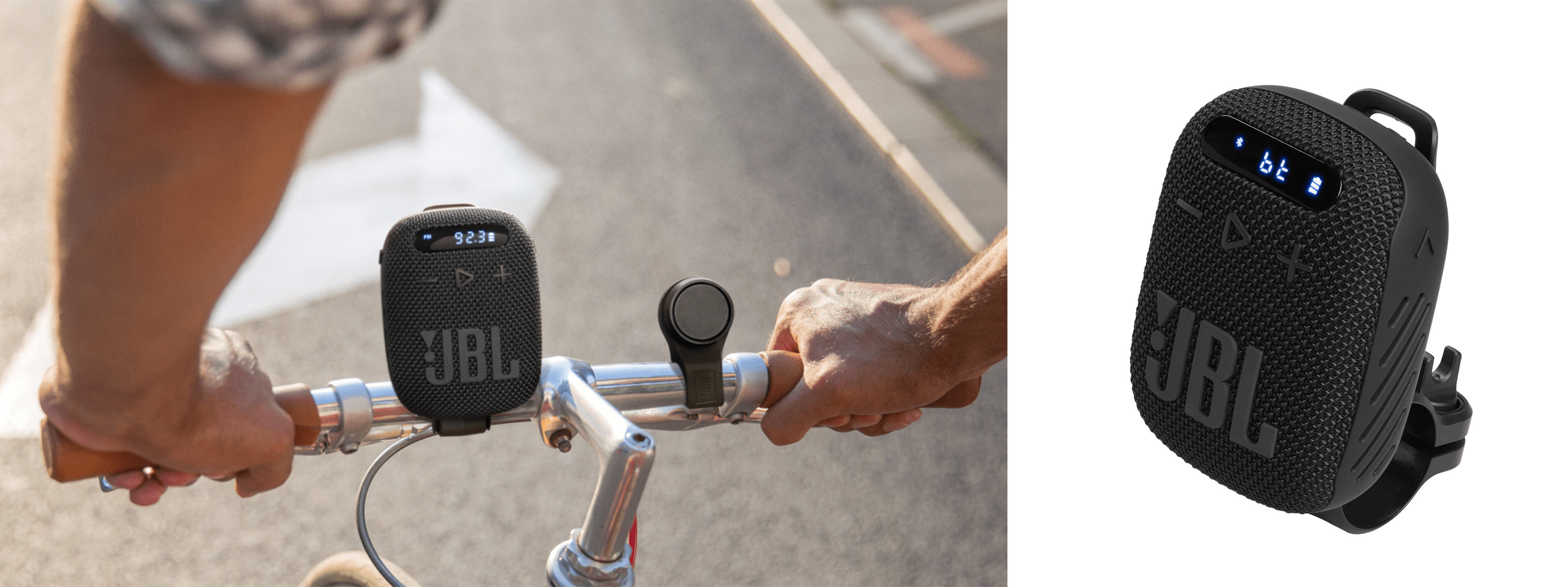今回登場する「JBL WIND 3」は、コンパクトな設計でインドアからアウトドアシーンまで持ち運びの利便性に特化したポータブルBluetoothスピーカーです。特に自転車やバイクなどの二輪車で移動することの多い方向けに、ハンドル部に取り付け可能なマウントキットが付属されており、ワンタッチで手軽かつ確実に着脱が出来るようになっています。また、走行時に耳を塞がずに音楽再生やナビ案内※2をお使いいただけます。視認性の高い自照式LED表示部や押しやすい大きなボタンなど、二輪車走行時の安全面にも配慮されています。