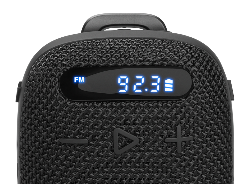 ボディには、手袋をつけた手でも確実に操作可能な、独立レイアウトされた大きな各種ボタンを配置しています。ボリューム調整は視認しやすい前面に、曲送り・曲戻しボタンは側面に配備。各役割のボタンを配置する位置をわかりやすく変えることで、誤操作を防ぎ、走行中の安全面にも配慮した仕様になっています。ボタンの押しやすさはもちろん、二回連続押し・三回連続押しの必要もない簡単操作が可能です。また、前面上部には、視認性の高い自照式LEDディスプレイを搭載。停車時に、バッテリー残量や受信中のラジオ周波数、選択中のオーディオモードなどの情報がひと目で確認できます。