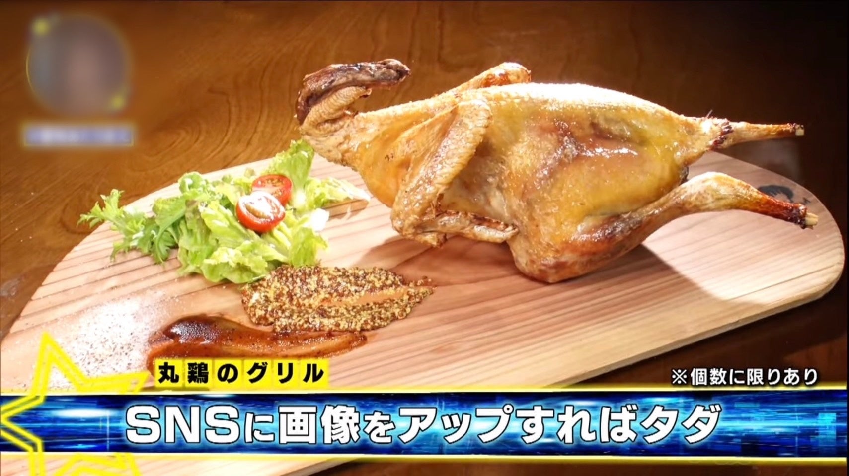 パリパリの皮が香ばしい。うまうまディマーレのメニュー、「丸鶏のグリル(658円)」はSNSにアップするとなんとタダでお客様に提供しています。(個数に限りあり)