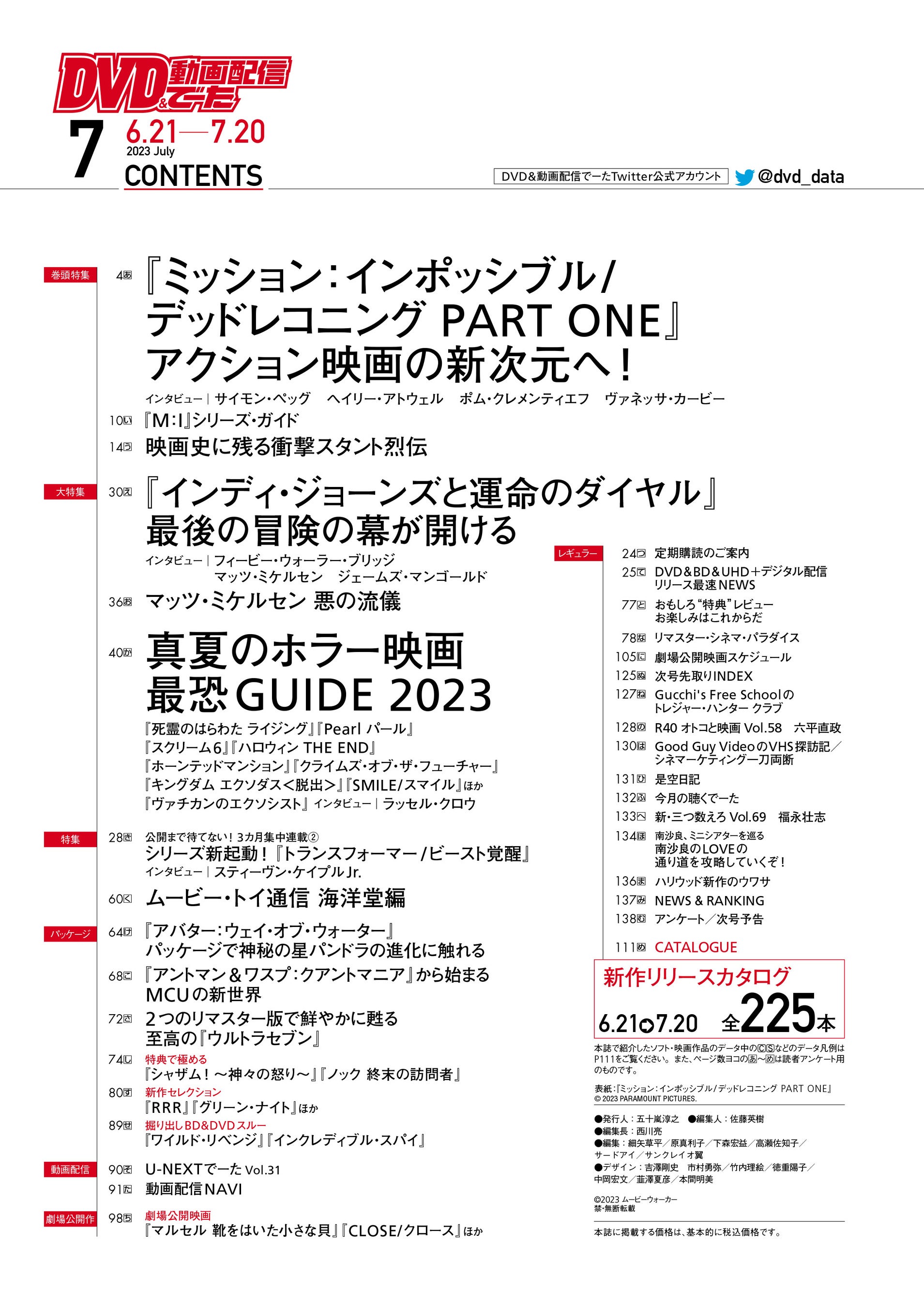 巻頭は、シリーズ第7作目になる、トム・クルーズ主演『ミッション:インポッシブル/デッドレコニング PART ONE』。限界に挑戦し続けるトム・クルーズのアクションについて徹底特集。これを読むと、トム&ミッションシリーズの凄さがわかる! また、今号でもう一つ見逃せないのが、「真夏のホラー映画最恐GUIDE」特集。今年の夏も様々な種類のホラー映画が公開される。最恐GUIDEでは、7~9月の夏のホラー映画を中心に、その先の期待作までイッキに紹介。今号も映画ファン注目のコンテンツが盛りだくさんでお届けします!