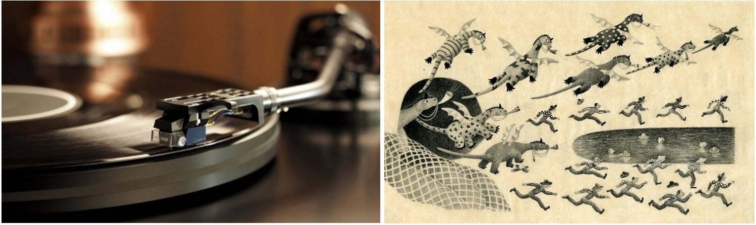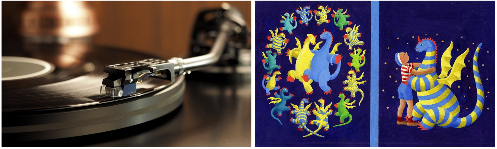 3冊からなる「エルマーのぼうけん」のクライマックスは、そらいろ高原の洞穴に捕らえられたりゅうたちをエルマーが助け出すシーンです。エルマーは一計を案じ、おもちゃの鉄砲を鳴らして合図をすると、りゅうたちはラッパや笛を慣らしながら、洞穴からいっせいに飛び立ちます。このクライマックスの大さわぎのシーンを、1950年代のフリー・ジャズのわくわくする響きを使って演出します。音源にはアナログレコードを使い、より臨場感がある効果をもたらします。