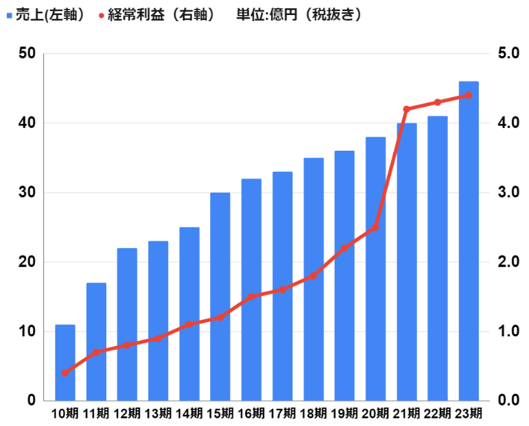 1998年6月26日に創業者の吉川充秀(ゴミ拾い仙人)が、「利根書店尾島店」を創業し、2023年6月26日に25周年を迎えました。25周年の直前に新井英雄へ代表が交代しましたが、依然業績は好調で23期(2022年7月1日~2023年6月30日)も増収増益となりました。下記グラフの通り10期(2009年7月~2010年6月)から14期連続の増収増益を達成しております。
