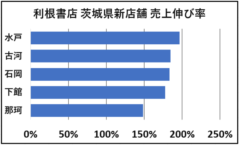 2022年7月に「株式会社ときわ」の事業継承を行い、現在までに5店舗を「ときわ書店」から「利根書店」としてリニューアルオープンしました。これらの店舗の業績は好調で、2023年5月の月間売上がリニューアル前の1年間の平均月間売上に比べて平均で約177%成長しました。一番業績を伸ばした店舗はトップ画像の「利根書店水戸店」で、約200%の伸び率です。