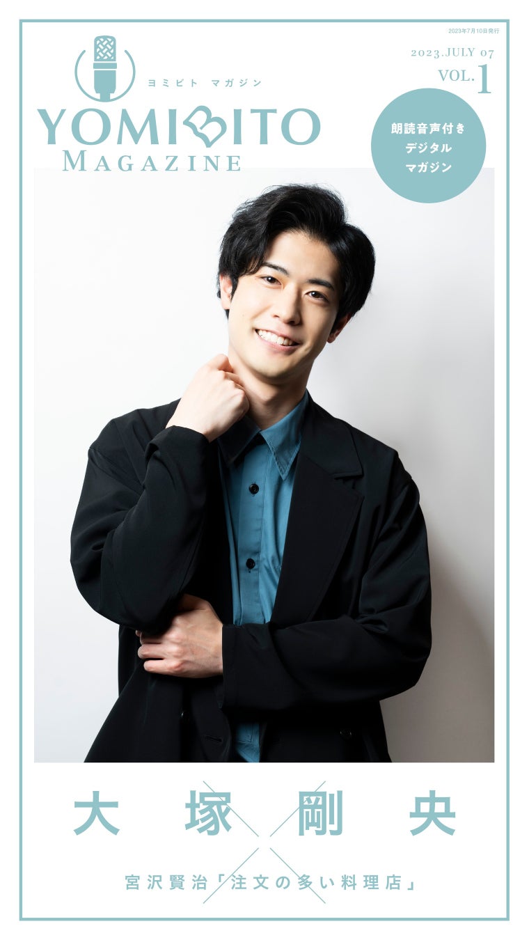 「YOMIBITO MAGAZINE」は、毎号一人の声優をピックアップするボイス&フォトマガジンで、声優による名作文学の朗読音声と、撮り下ろし写真、インタビューテキストなどをたっぷり収録しています。第1号には、TVアニメ『【推しの子】』アクア役や『SYNDUALITY Noir』カナタ役、『AIの遺電子』須堂 光役などで活躍する大塚剛央が登場。宮沢賢治の名作『注文の多い料理店』の朗読、スタジオでの撮り下ろし写真やロングインタビュー、そして動画メッセージを通して声優・大塚剛央の魅力に迫ります。