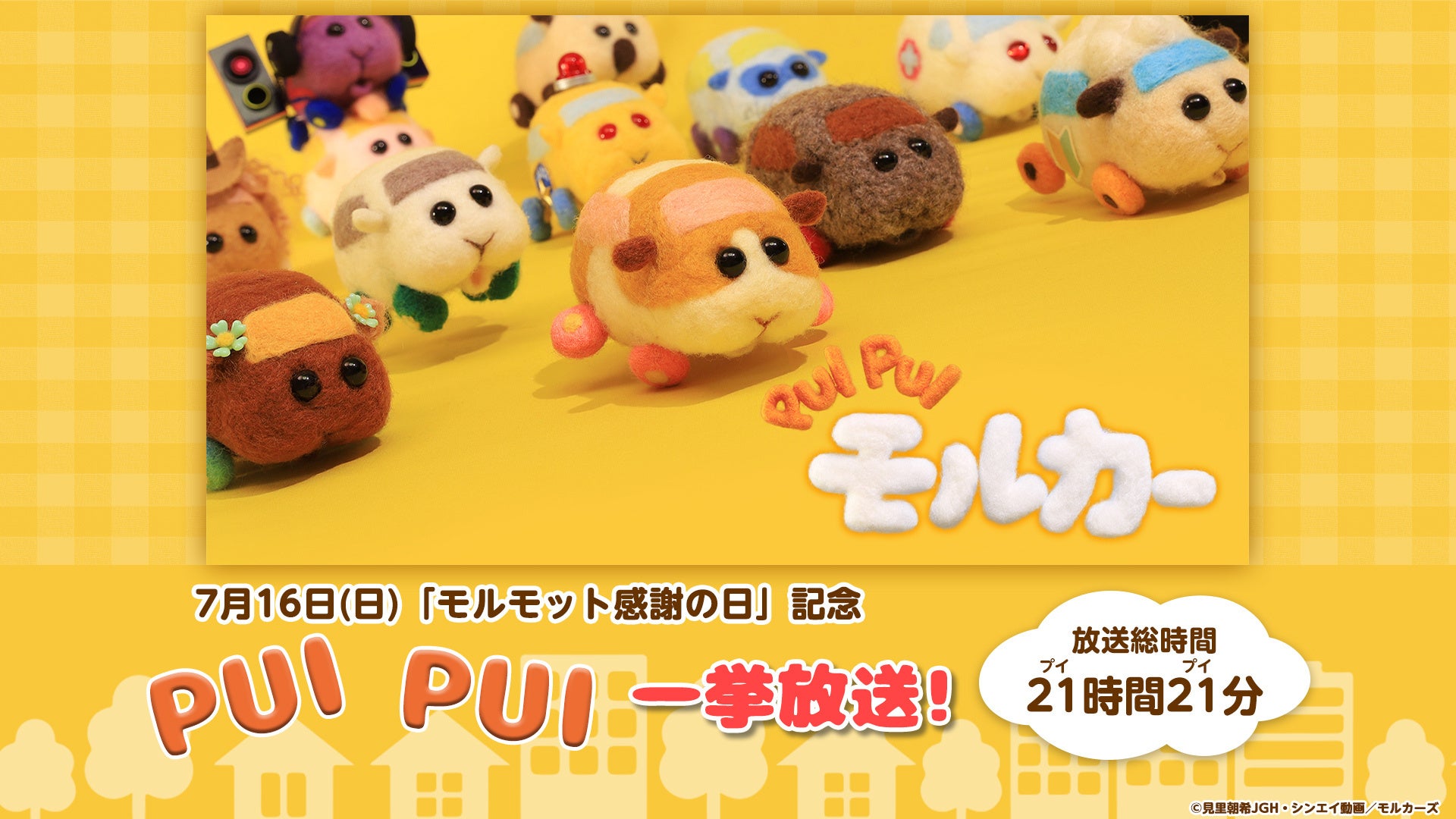 7月16日(日)“モルモット感謝の日”当日に、モルモットが車になって大活躍するアニメーション作品「PUI PUI モルカー」全話を21時間21分(プイプイ)間繰り返し放送する一挙放送など全5作品をお送り致します。