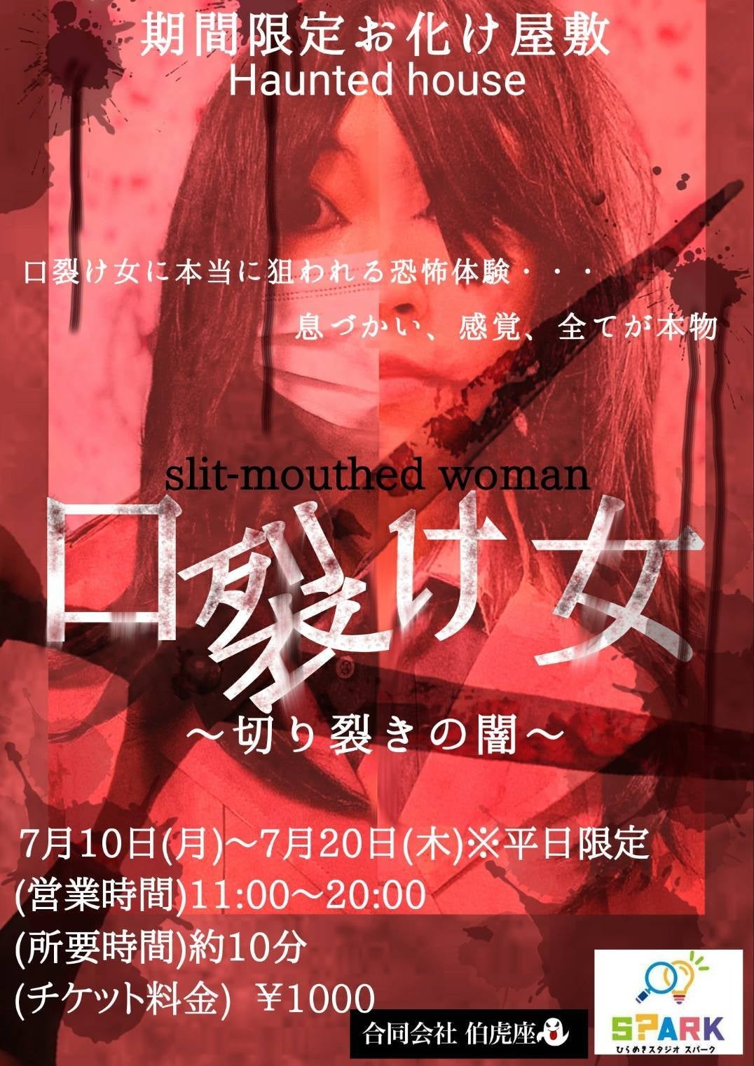 ▪️誰もが知る『口裂け女』をテーマにサクッと気軽に恐怖が体験できるお化け屋敷が関西を代表するホラー企業【合同会社伯虎座】の監修の元、天保山マーケットプレース2FひらめきスタジオSPARKに期間限定登場!!