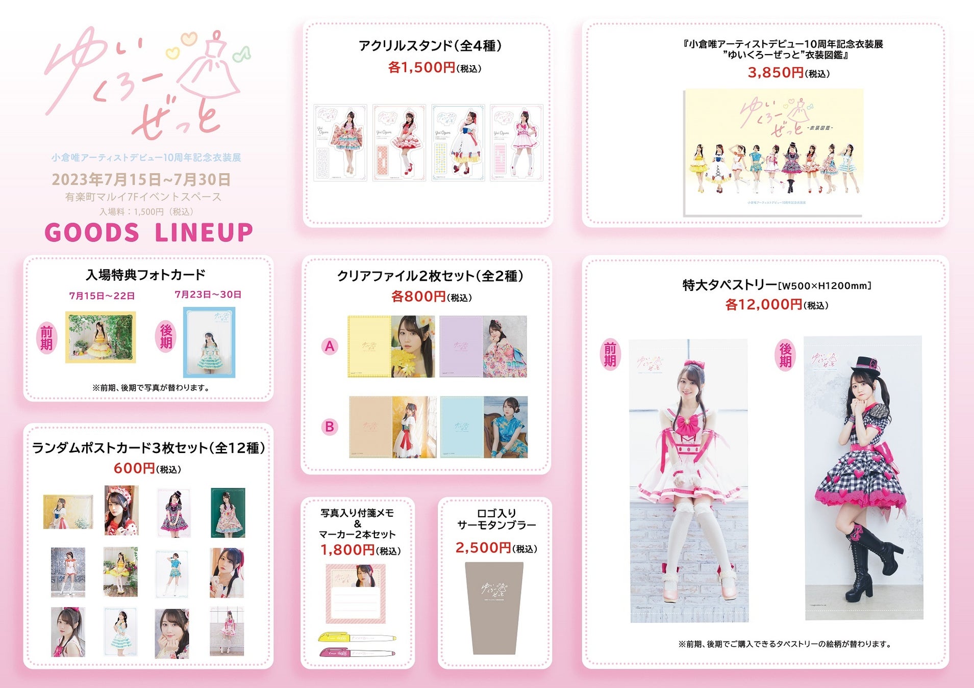 7月15日(土)~7月22日(土)までが前期、7月23日(日)~7月30日(日)までが後期の二期制で、後期からは7月17日(月祝)に開催される『小倉 唯 Memorial LIVE 2023~10th Anniversary Assemble!!~』の衣装の一部も追加展示されます。