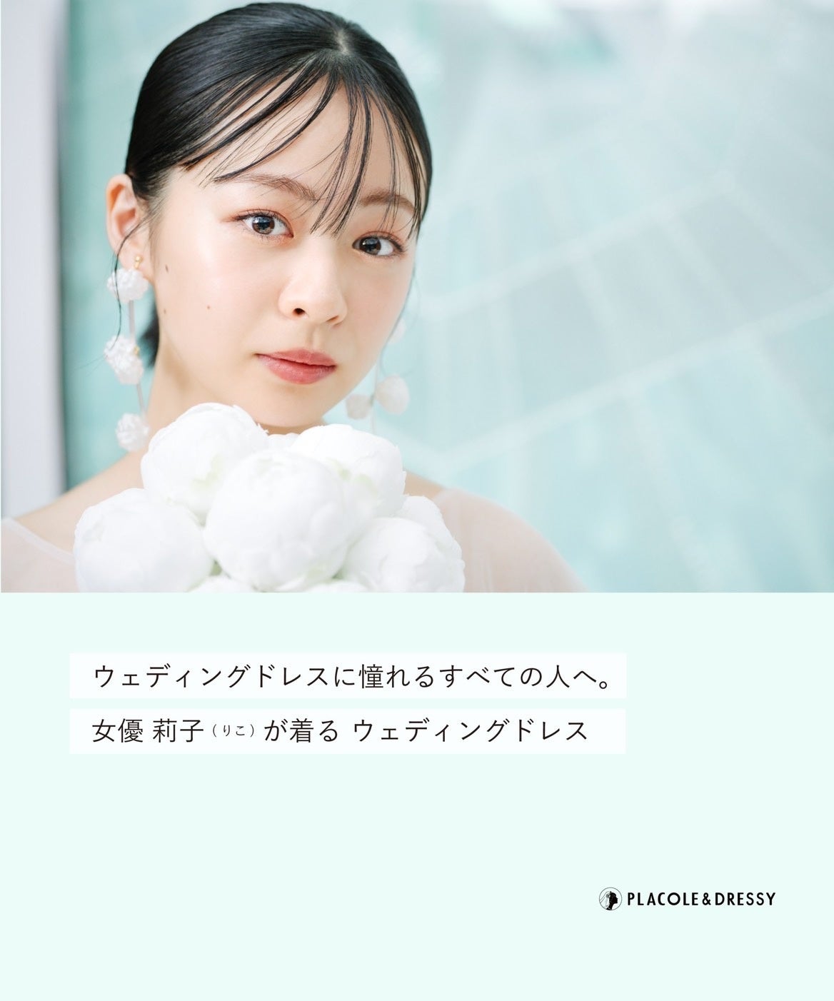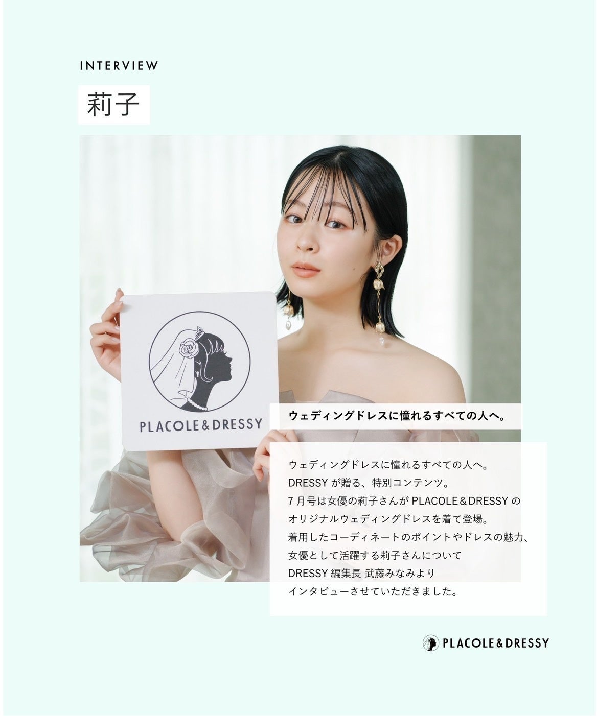 7月号は女優として活躍くする莉子さんがPLACOLE&DRESSYオリジナルウェディングドレスを着て登場。着用したコーディネートのポイントやウェディングドレスの魅力、女優として活躍する莉子さんについて DRESSY編集長 武藤みなみよりインタビューさせていただきました。