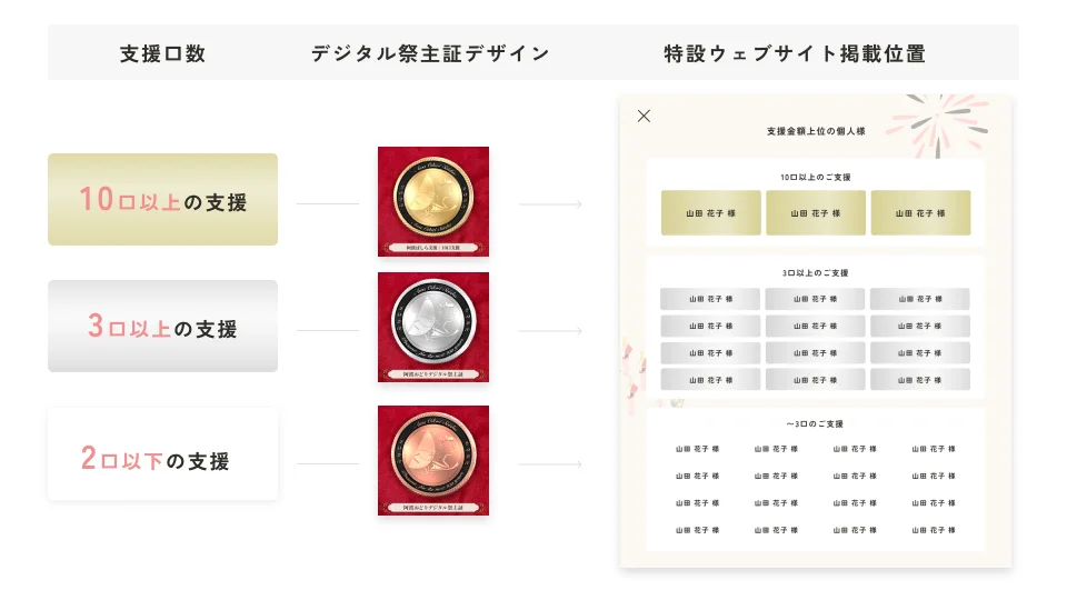 まずデジタル祭主証についてです。口数に応じてゴールド、シルバー、ブロンズの3つのデザインがあり、口数が多いほどデザインが変わります。また特設サイトでの掲載順も上の方になります。