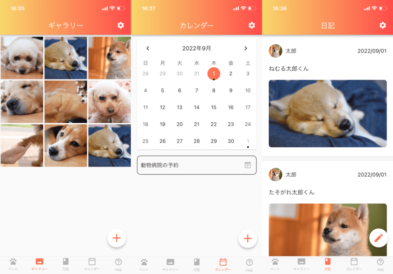 ギャラリーや日記機能を使って思い出記録もでき、家族を招待して簡単共有・同時編集が可能です。獣医師監修の様子がおかしいと感じた時のFAQもアプリ内でチェックできます。