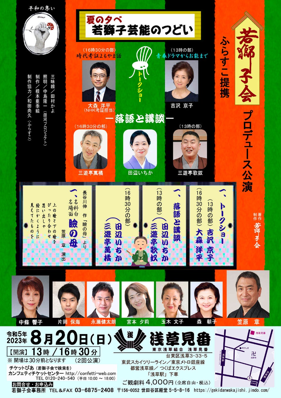 お芝居と落語・講談、そしてトークショーと、一日限りの【芸能のつどい】を催します。若獅子は、久し振りに名作『瞼の母』の水熊の座敷の場を、名場面・名科白として観て頂きます。