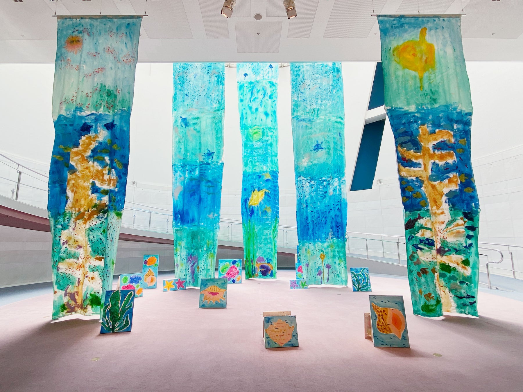 本展では、スパイラルガーデンのアトリウム空間をダイナミックに彩る、海の中を描いた《珊瑚礁を横から見る》(2023)をはじめ、海の中の生き物や海辺の情景などを描いた新作約50点を中心に紹介します。全身で海を感じられる夏らしい空間をぜひお愉しみください。