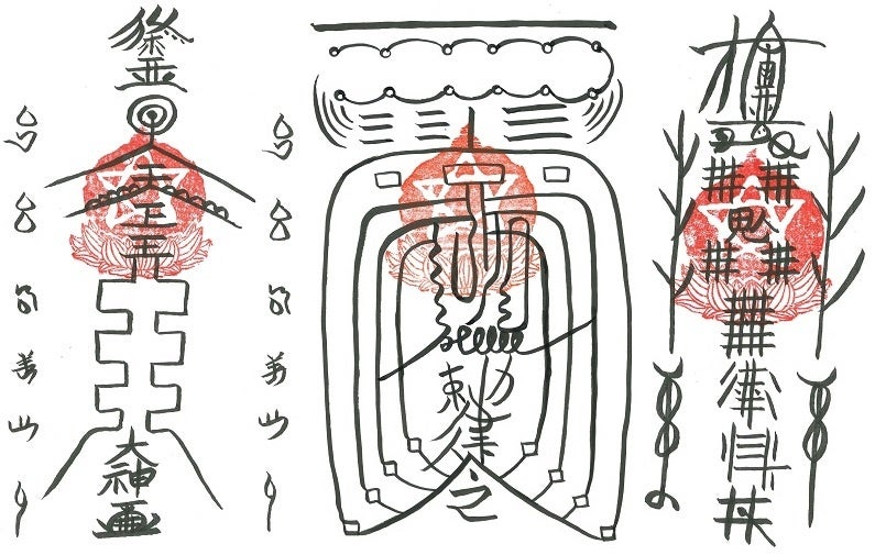 ◆本書を護る霊符(左)/守護霊供養の霊符(中)/生き霊退散の霊符(右)
