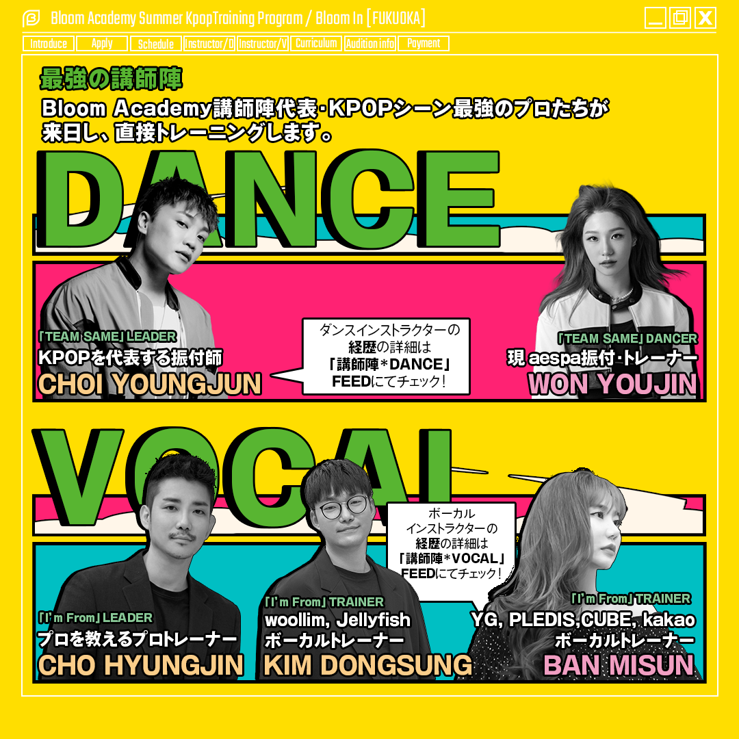 KPOPを代表するTEAM SAMEのリーダーチェ・ヨンジュン氏、韓国のボーカルアカデミー「I’m From」の代表を務めるチョ・ヒョンジン氏を始め、現「aespa」振付師兼トレーナーなど、本場の超一流講師陣が実際にトレーニングを行います。