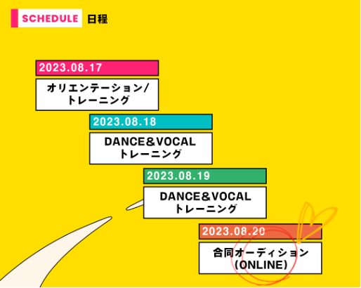 開催期間は、2023年8月17日(木)から20日(日)までの4日間で、最終日には「合同オーディション」をオンラインにて実施いたします。オーディションには、YG ENTERTAINMENT、SOURCE MUSIC、THEBLACKRABELを含めて20社以上の事務所が参加する予定です。
