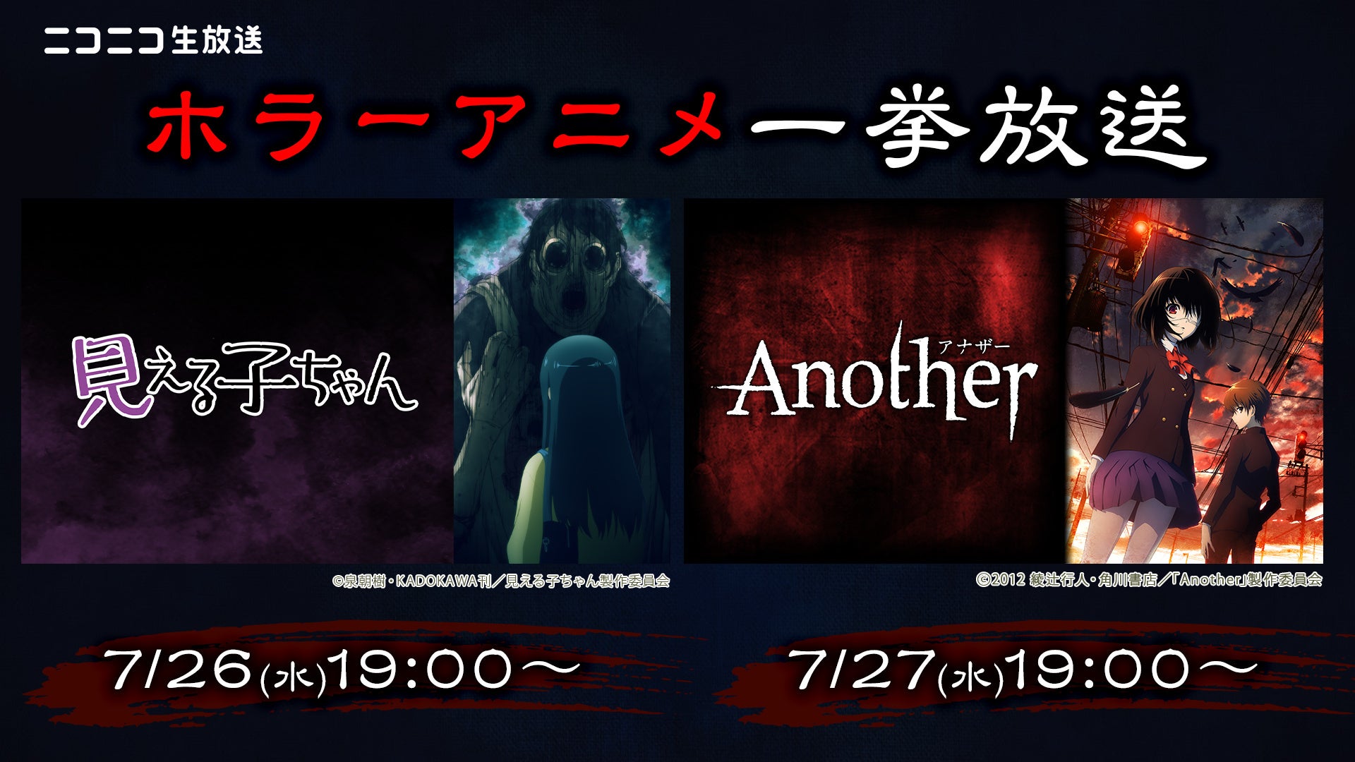 ラインナップは「見える子ちゃん」「Another」の2作品。どちらの作品も、会員登録不要・無料でご視聴いただけます。
