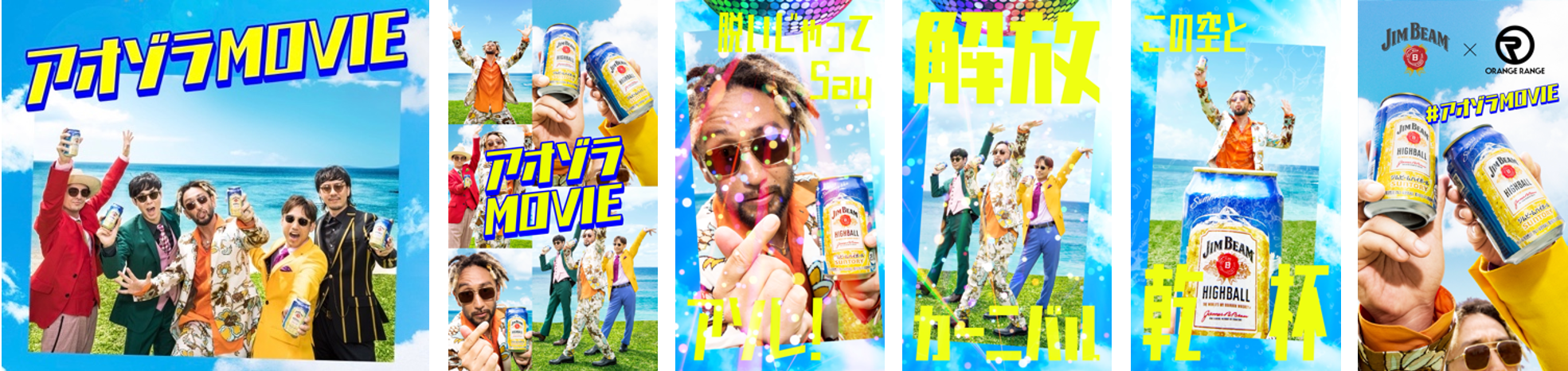 さらに、ORANGE RANGEと夏の思い出ムービーを作ることができるWEBコンテンツ「アオゾラMOVIE」も公開。ジムビームハイボール缶を購入し、缶に記載のQRコードから特設サイトへアクセスすることで、コンテンツをお楽しみいただけます。