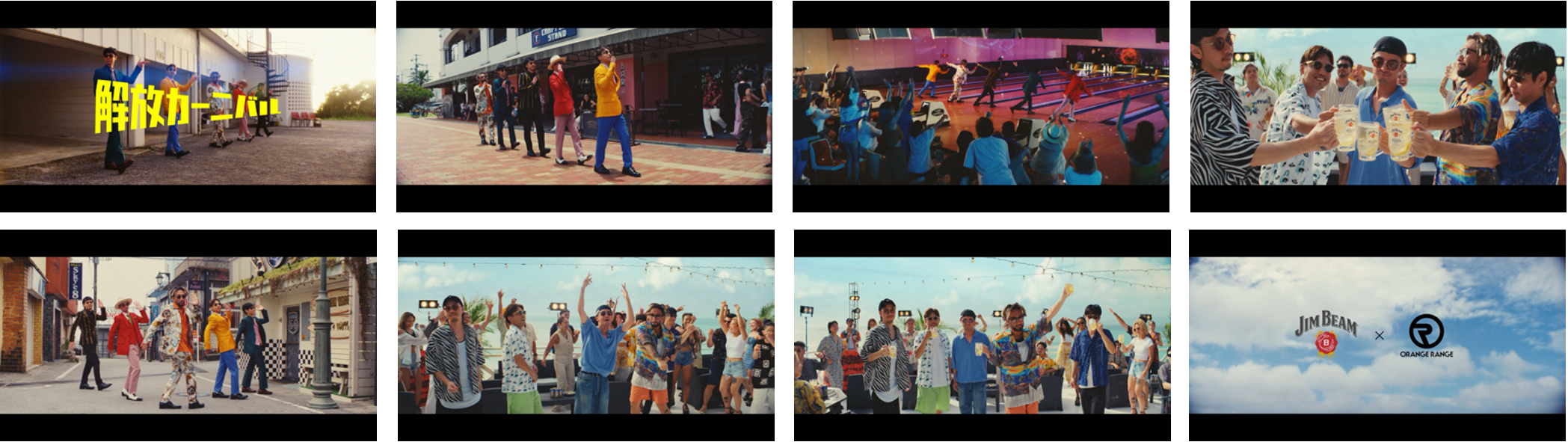 コラボ企画では、ジムビームの世界観を表現したコラボソング「解放カーニバル」をORANGE RANGEと制作。7月12日(水)0時より各音楽配信サービスで配信をスタートしました。また、同曲のミュージックビデオを7月12日(水)21時より、ORANGE RANGE公式YouTubeチャンネルにてプレミア公開。沖縄の青空をバックに、ミュージックビデオでは初挑戦となったカラフルなスーツ姿のメンバーが踊ったり、ジムビームハイボールを片手にパーティーを楽しんだり、解放感あふれる内容となっております。