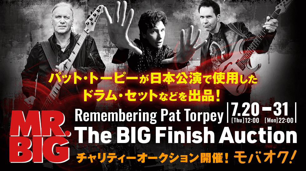 本オークションでは、世界的ロックバンドMR.BIGの撮り下ろしメッセージビデオや直筆サイン入りアイテムなど貴重なアイテムが多数出品されます。さらに、ドラマーであるパットが参加した日本公演で使用され、さらに2018年にカリフォルニアで開催されたトリビュート・ライブで様々な著名ドラマーも演奏した貴重なドラム・セットになります。