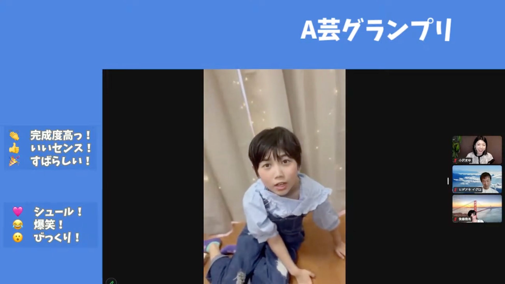 例えば、練習量なら負けない、なのか、本番の空気にのっかれる(アドリブがきく)、課題自体を作り込める、他人にない発想をもっている、自己紹介がすごく素敵、めっちゃ友達になりたくなるひと、A芸キッズに絶対になりたい気持ちがすごい、などなど色々あると思いますが、今回のグランプリでは自己紹介含め、自由に取り組める分、自分なりの何をやりたい!どこを見てもらいたい、評価してもらいたい、が明確にあるほうが私の胸には刺さりました。