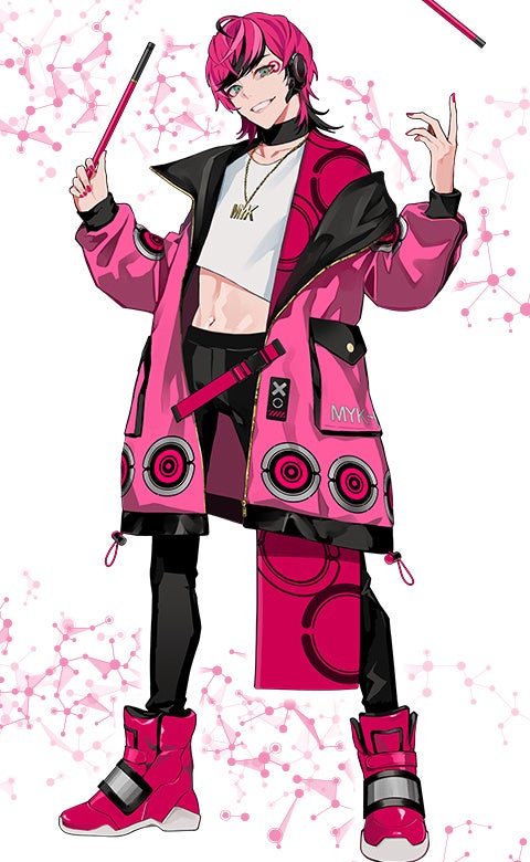 手に持ったドラムスティックはマイク兼用。衣装にあしらわれた幾何学模様はスピーカー一体型のドラムパッドになっており、音色も自由にカスタマイズできる。