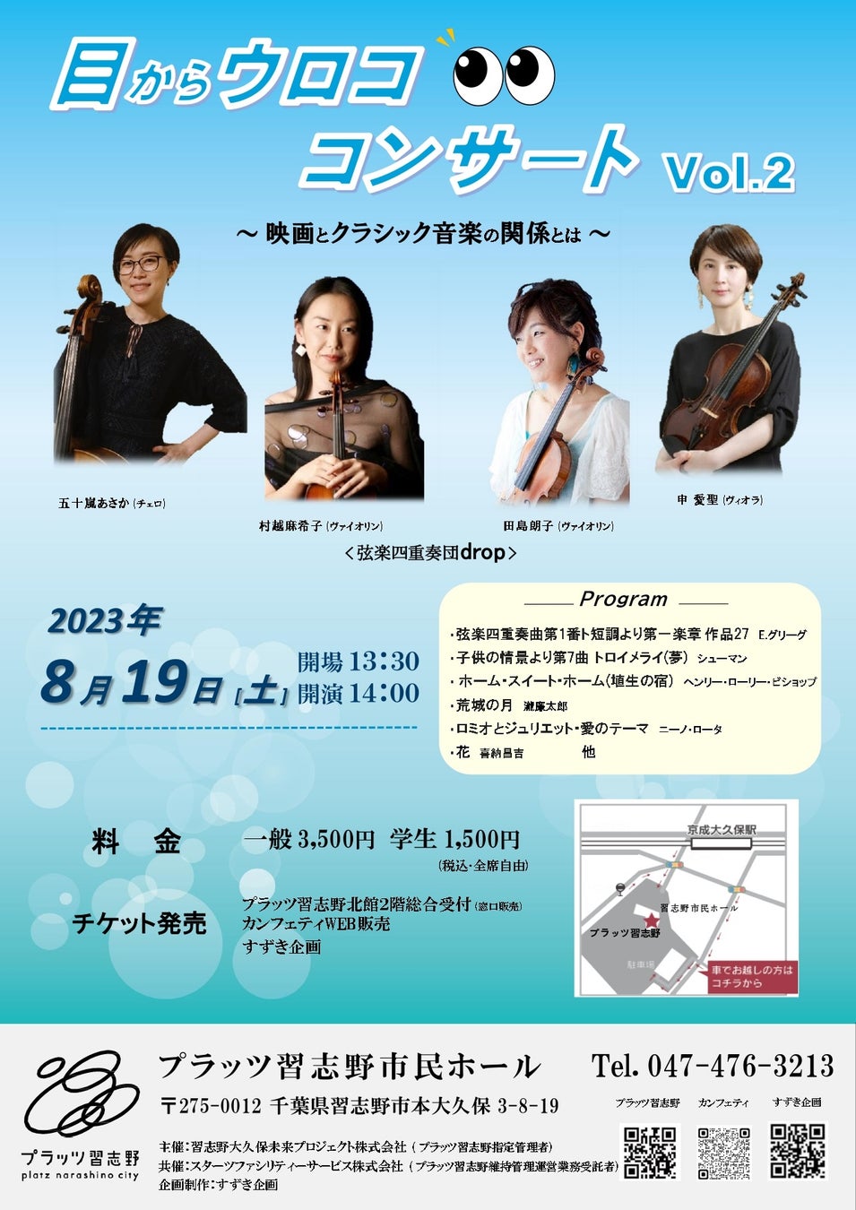 全国で活躍する弦楽四重奏団 dropが、映画とクラシック音楽の関係を解説するコンサートです。プラッツ習志野市民ホールでの演奏は、前年に続き、2回目となります。弦楽四重奏の奏でるハーモニーをお楽しみください。