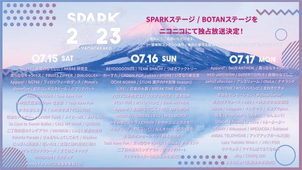 HKT48、NGT48、STU48、FRUITS ZIPPER、つばきファクトリー、BEYOOOOONDS、OCHA NORMA、Appare!、真っ白なキャンバス、JamsCollectionなどが出演する”SPARK STAGE”と