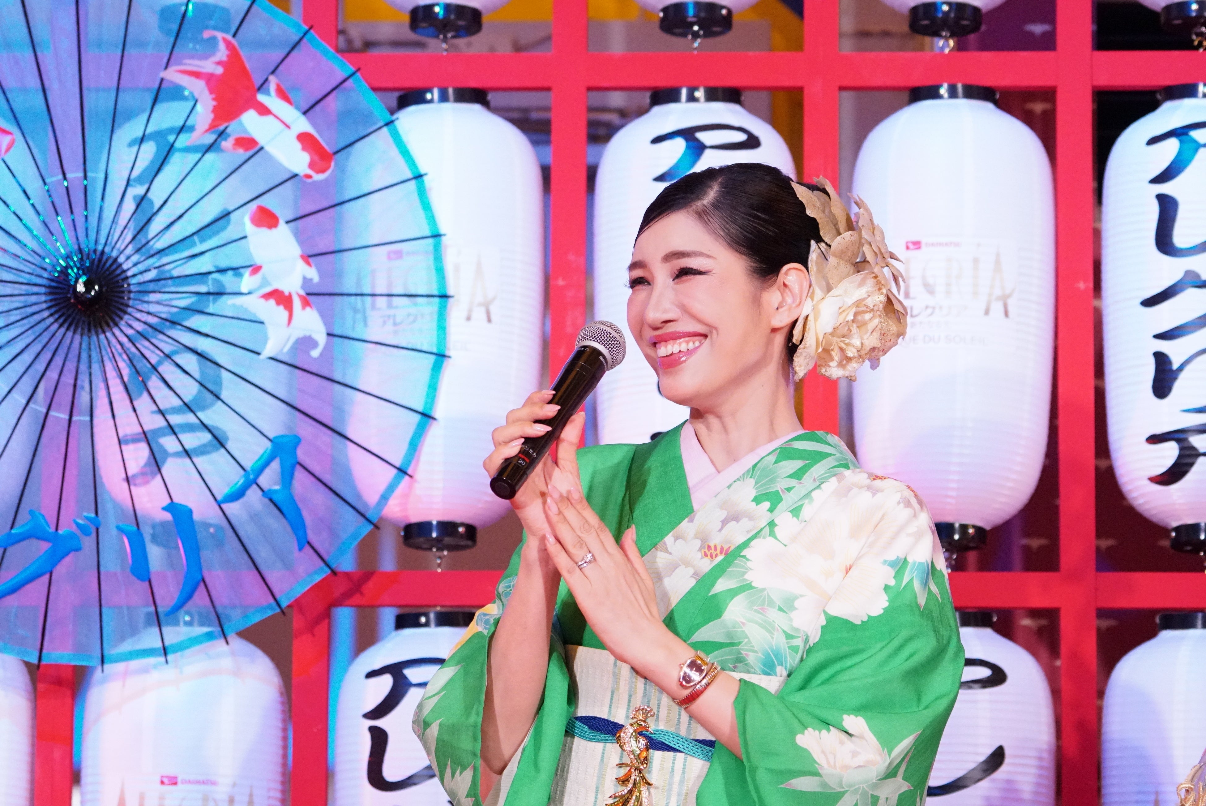 続いてレッドカーペットへ姿をあらわしたのは艶やかな浴衣姿のアン ミカさん。アレグリアの赤に映えるように緑で真夏のフェスティバルをイメージしてみたというアンさんは「アレグリアは世界で唯一無二の身体表現と生の音楽や照明が組み合わさった総合芸術。観ると明日から生きる元気が出ます!ハッピー!ラッキー!アレグリア!」と語ってくれました。
