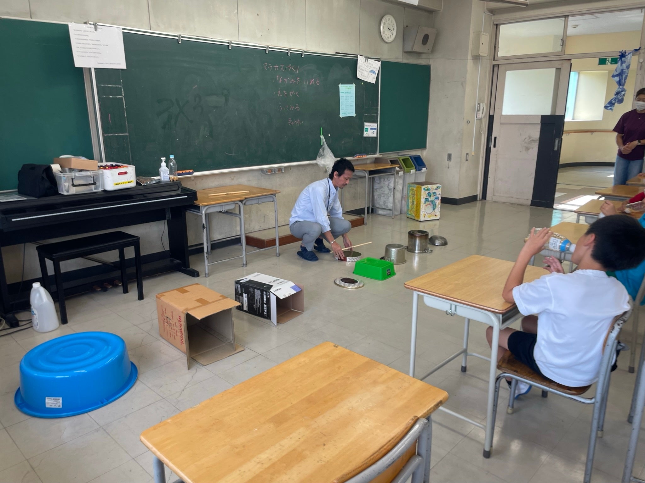 マラカスの振り方もすぐにマスターして演奏できるようになり、お鍋やタライ、段ボールなどの音も「これは高い音」「こっちは低い音」など、普段は叩けない物を叩くとどんな音がするのか?真剣に聴き分けていました。
