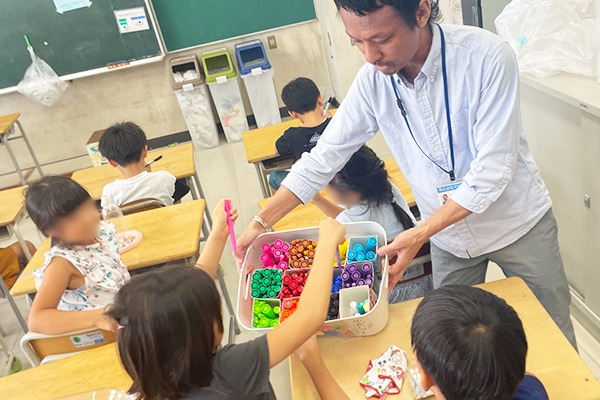 空きペットボトルを使ってマラカスをつくり、普段身の回りにある物を「太鼓」して一緒にリズム遊びをする内容で、「蒔田小学校放課後キッズクラブ」「井土ヶ谷小学校放課後キッズクラブ」に続き3回目の開催です。