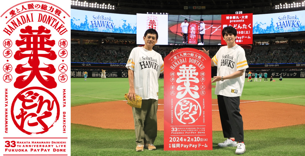 この度、7月15日(土)福岡ソフトバンクホークスの本拠地である「福岡PayPayドーム」にて、博多華丸・大吉の二人がセレモニアピッチ(始球式)に登場し、来年2月10日(土)福岡PayPayドームにて「博多華丸・大吉 presents 華大どんたく」を開催することを発表いたしました。