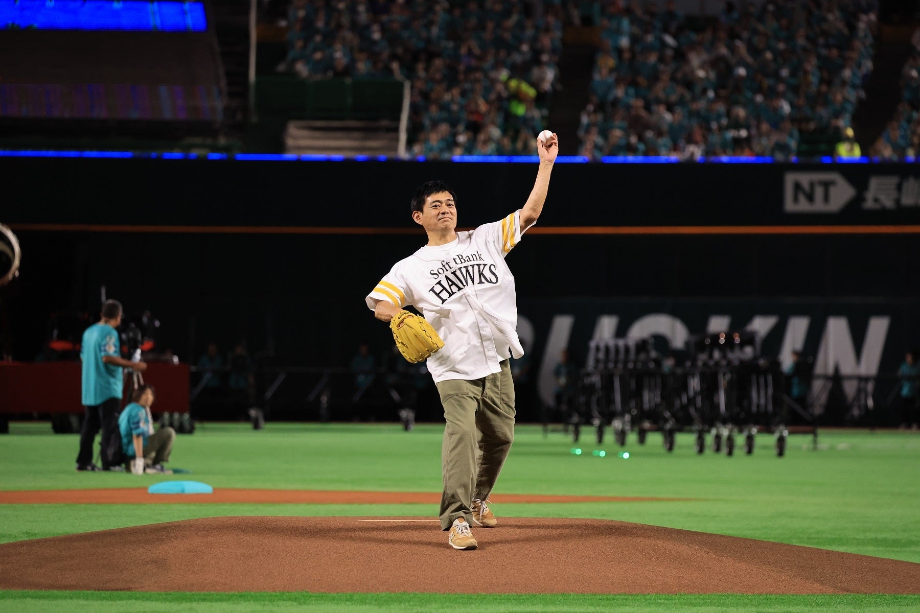 福岡ソフトバンクホークスの試合前に行われたセレモニアルピッチ(始球式)、囲み取材の様子をご紹介します。