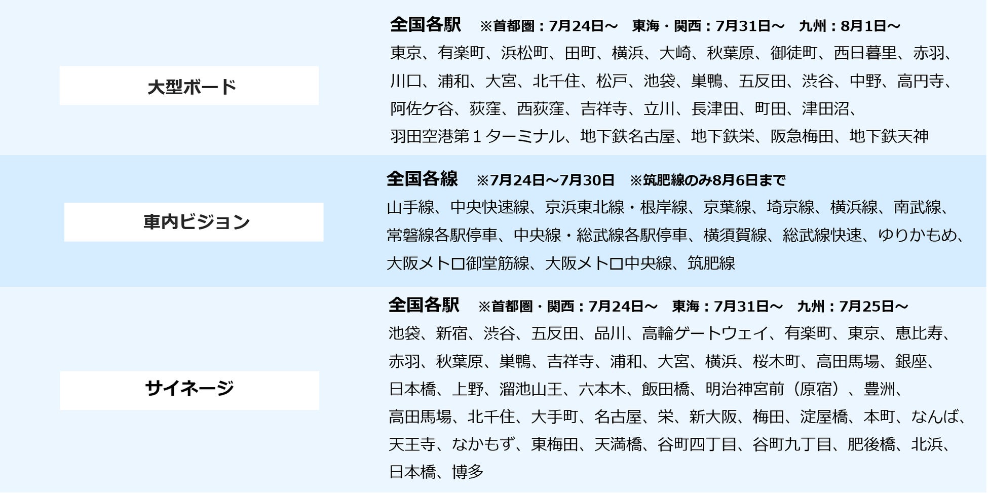 全国60駅以上の大型ボードやデジタルサイネージで広告を展開。トレインチャンネルなど車内ビジョンでもCM映像を放映します。
