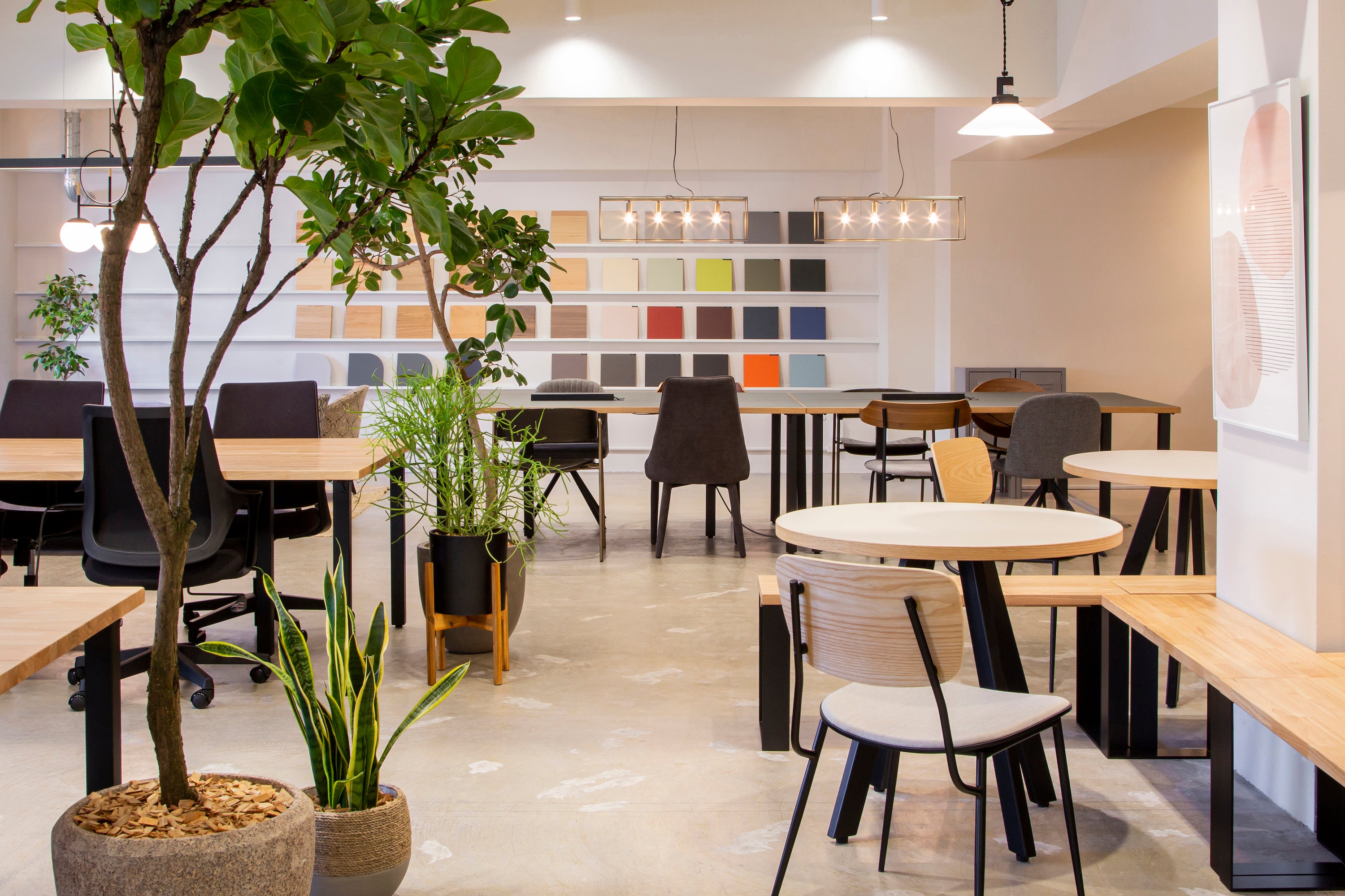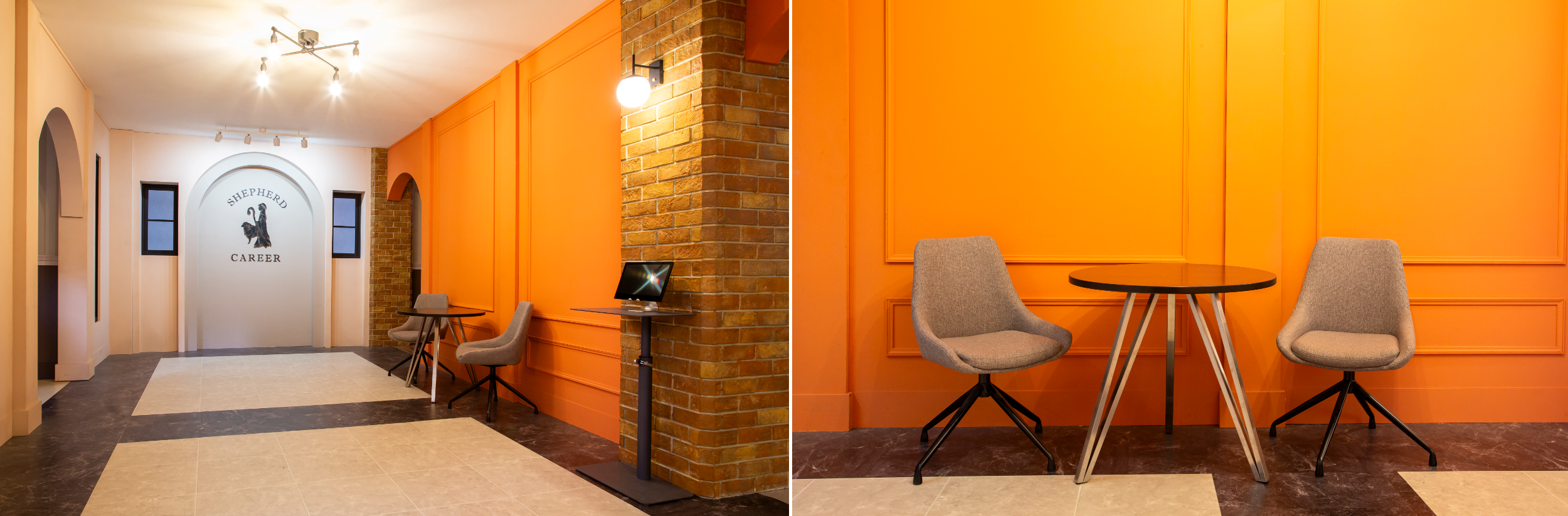 さらに「THE TABLE / くるみ」に加えて、「THE SHELF」「THE BENCH」「THE CAFE TABLE」等、3000通り以上の組み合わせが可能な家具「THEシリーズ(ザ・シリーズ)」が取り入れられています。当社の強みであるサイズオーダーも最大限に活用して、空間にぴったりフィットする家具が選ばれ、空間表現の幅を最大限に活かしたコーディネートが展開されています。