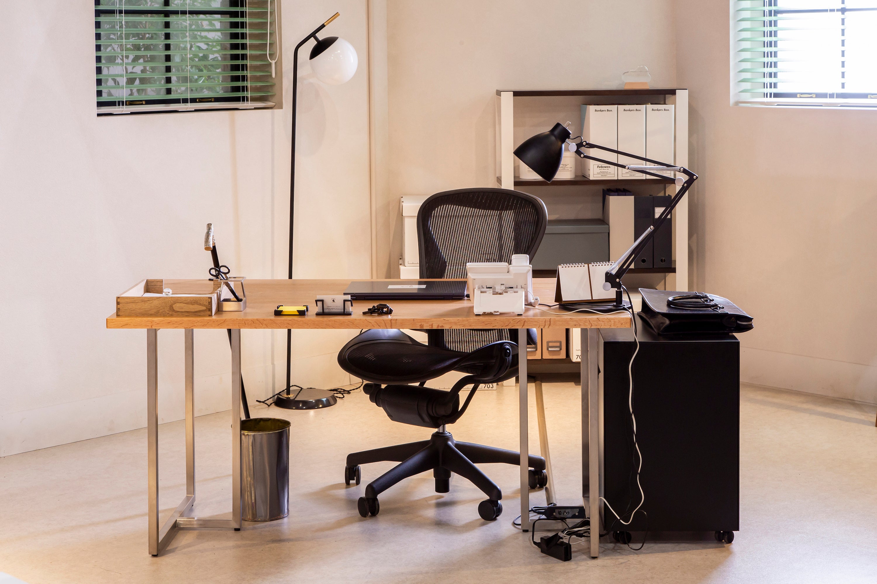 セットのメインアイテムとした木製デスクには、KANADEMONOの「THE TABLE / くるみ × Stainless」からT脚とTrapezoid脚を起用いただきました。デスクの脚をステンレスにすることで、無機質なオフィスと温かみや軽快さのバランスをとっています。