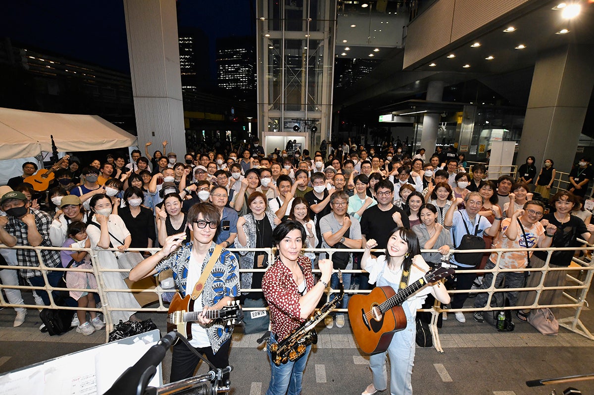 武田は、「屋外での公開収録は初めて。どうして今回公開収録をしようと思ったかというと、すごくいい曲ができちゃったんです!」と新曲リリースの喜びを表現。さらに、「今日のサックスは2020年の紅白(歌合戦)で五木ひろしさんの前で腕立て伏せしたときのサックスです」と愛用のサックス・ヤマハ YAS-82ZBを紹介し、客席に向けては「(会場の)浜松町で一つになれないで、どうして地球が一つになれるんですか!」と笑顔で手拍子の指導もするなど、約1時間半にわたってエネルギッシュなステージを披露しました。