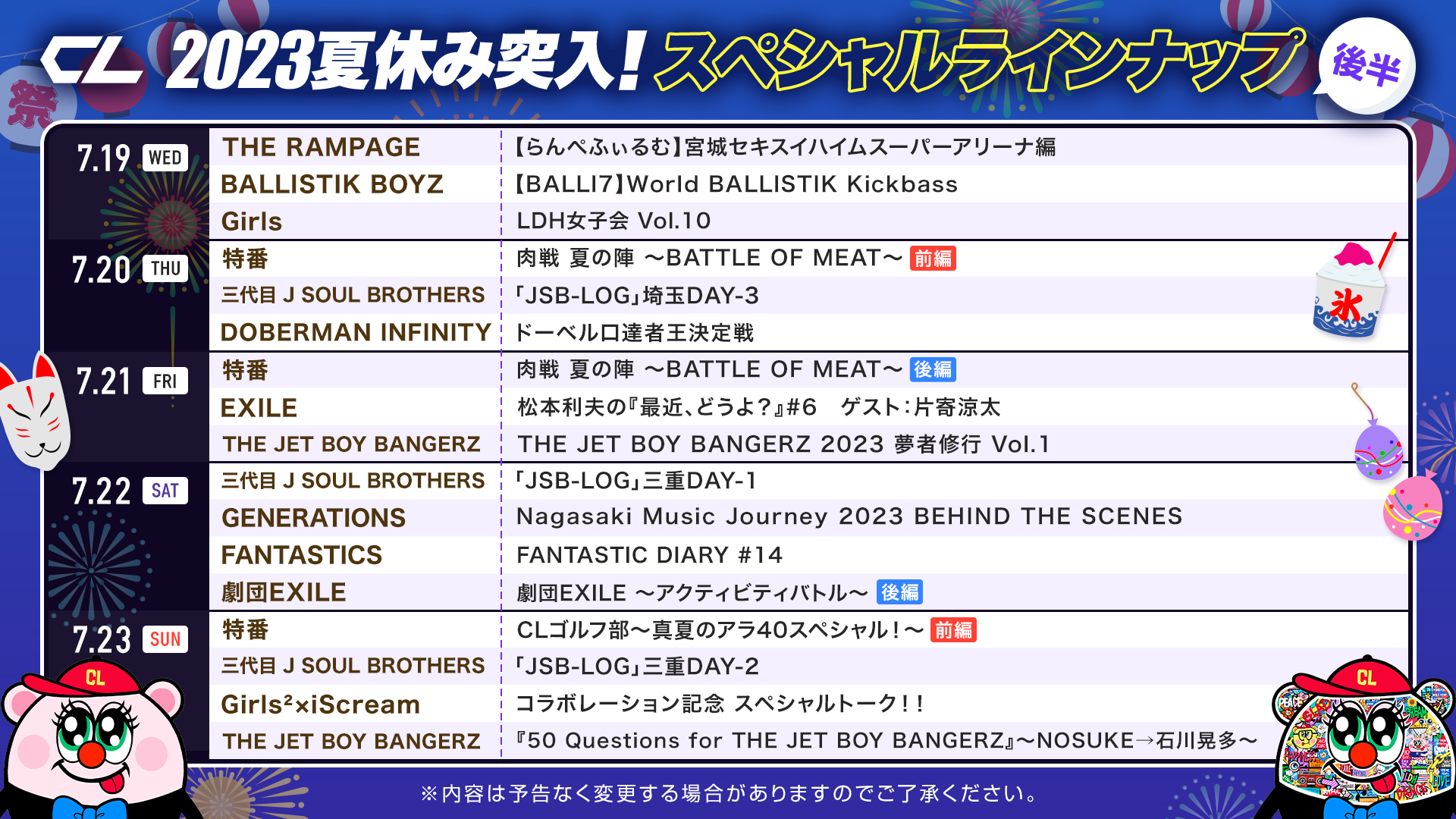 株式会社CyberLDH(本社:東京都渋谷区、代表取締役会長:森雅貴、代表取締役社長:藤田晋)は、LDHのコンテンツをお楽しみいただけるデジタルコミュニケーションサービス「CL(読み:シーエル)」で放送する「2023夏休み突入!スペシャルラインナップ」の後半を発表しました。