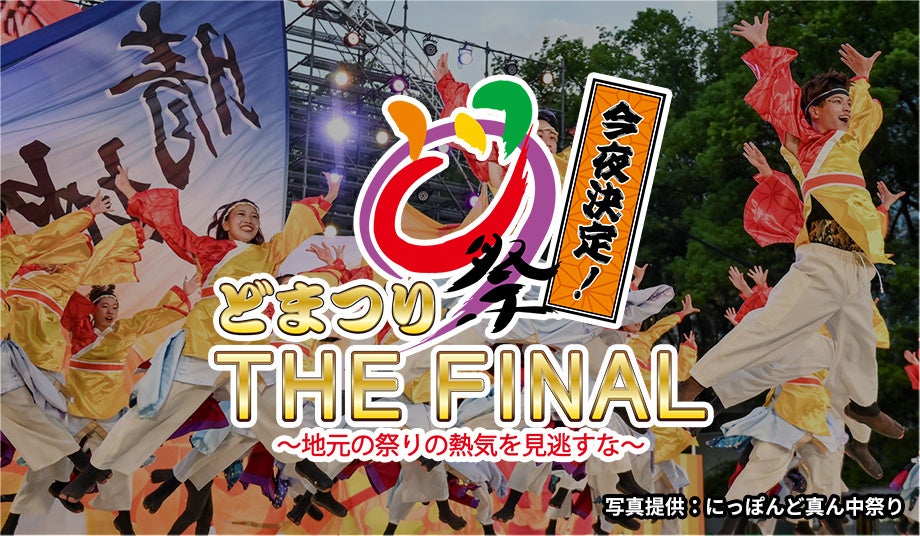番組概要:真夏の『尾張』名古屋を舞台に繰り広げられる日本最大級の踊りの祭典、にっぽんど真ん中祭り。この夏、25回を迎えるこの「どまつり」ファイナルコンテストの模様を、生放送でお届けします。地元愛知県出身のキャイ~ンの天野ひろゆきさん、元タカラジェンヌの遼河はるひさん、そして、タレントの高橋みなみさんをMCに、熱気あふれる13チームのステージをお届けします!今回、各チームの演舞中には「見どころバー」を表示し、視聴者の皆さんにわかりやすく楽しんでいただけるよう工夫。また、視聴者の皆さんには大賞受賞チームを予想していただき、番組に参加してもらいます。果たしてどまつり大賞はどのチームになるのか!?ご期待ください。