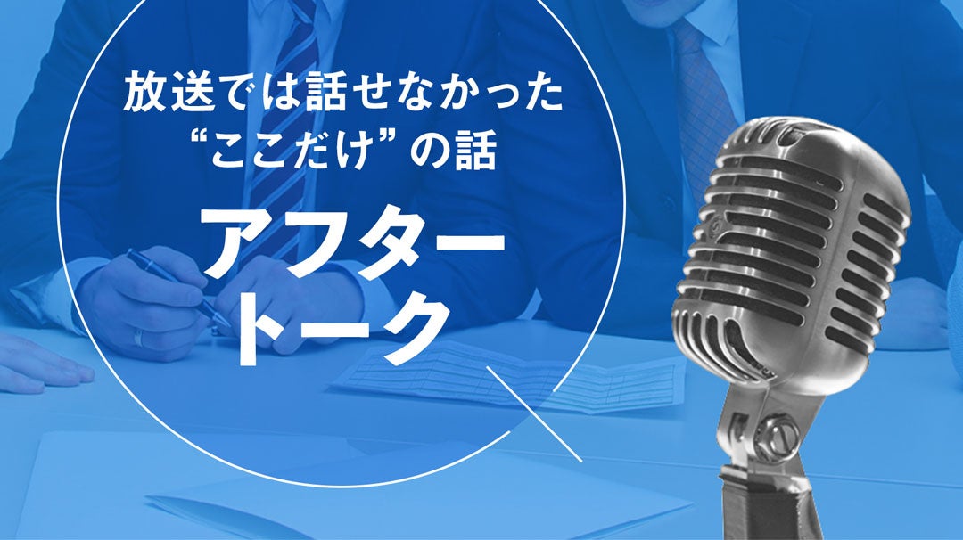 日経CNBCが放送する番組は、視聴者の皆さんの見やすさを考慮して概ね約10分で構成しています。生放送を終えて一息付いた出演者(兵頭氏・岩本)が、番組内容の補足説明や、放送では触れることができなかった“ここだけの話”をスペシャル動画「アフタートーク」としてお届けします。