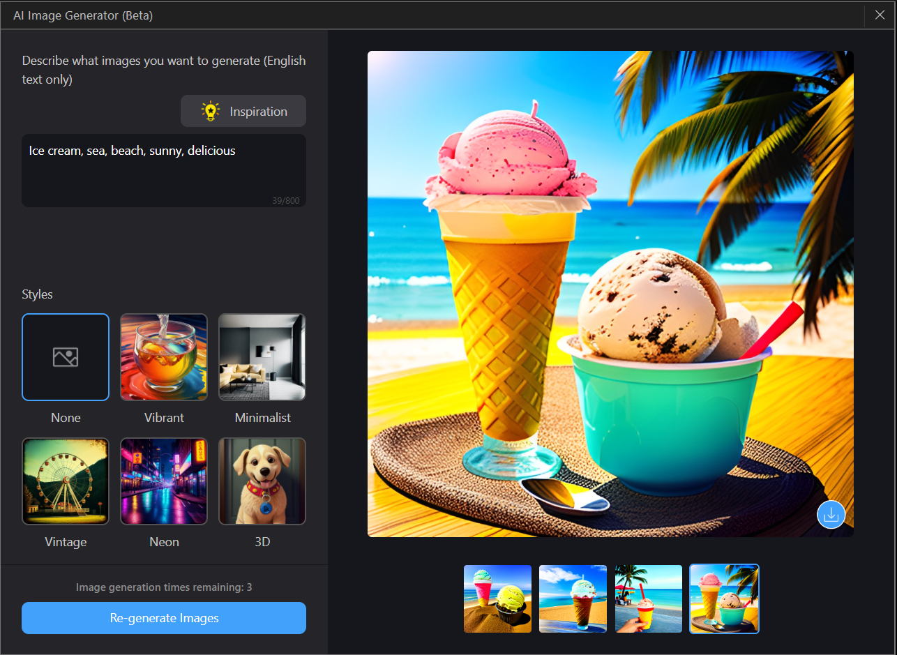 文字で説明するだけで、思い描いたイメージを AI が自動で作成します。アイデアをさらに探りたいときや、必要な画像などが見つからないときに便利です。最新の AI 技術で、驚くほど正確に画像を生成してくれます。