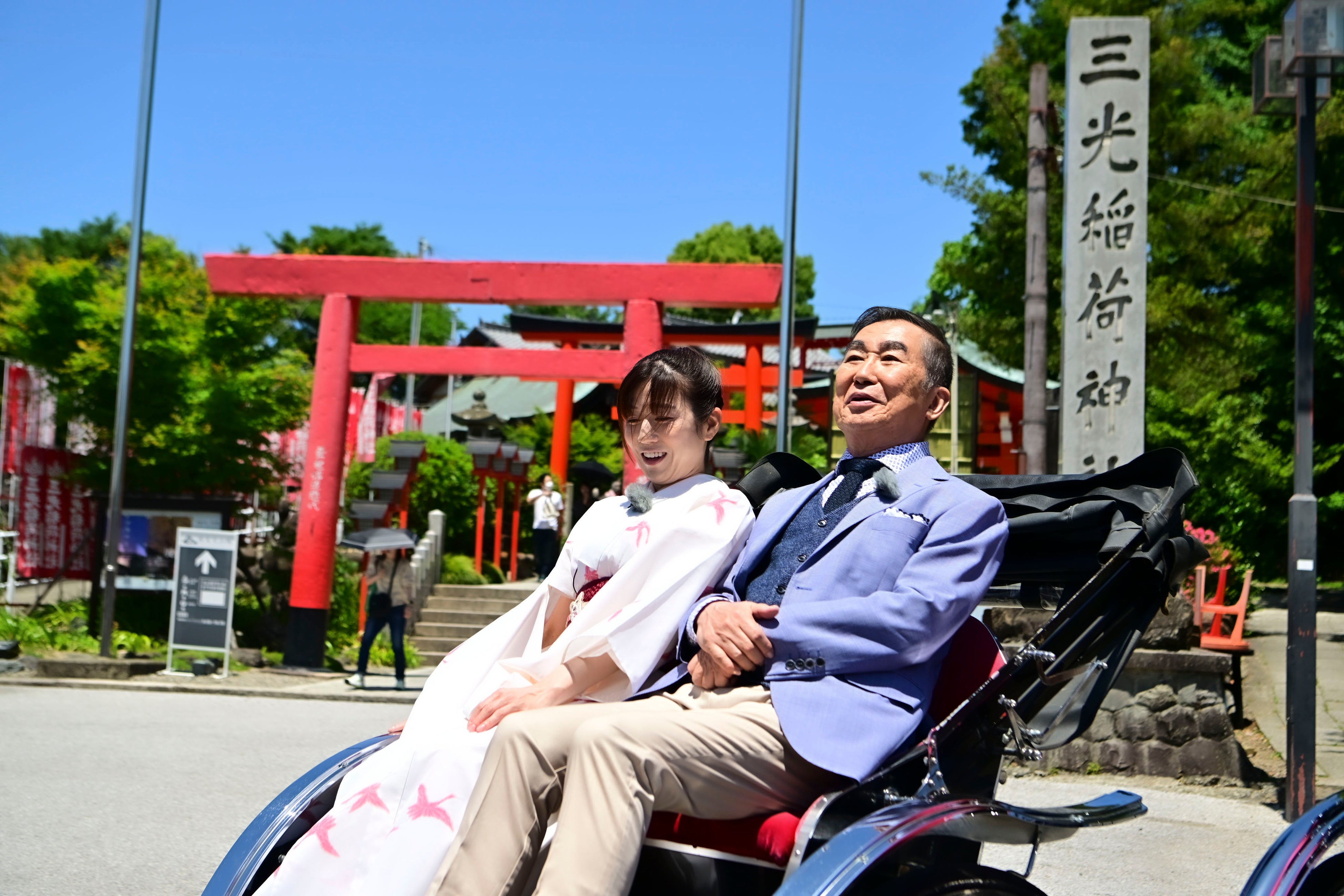 この人力車の車夫は、愛知県住みます芸人をしながら車夫歴9年をほこる犬山市出身の小鈴木が担当。小鈴木の軽快な運転で、火の見やぐらなどが残るレトロな風景を眺めた文枝は、「街並みが昔風でいいなあ」と、目を細めていました。
